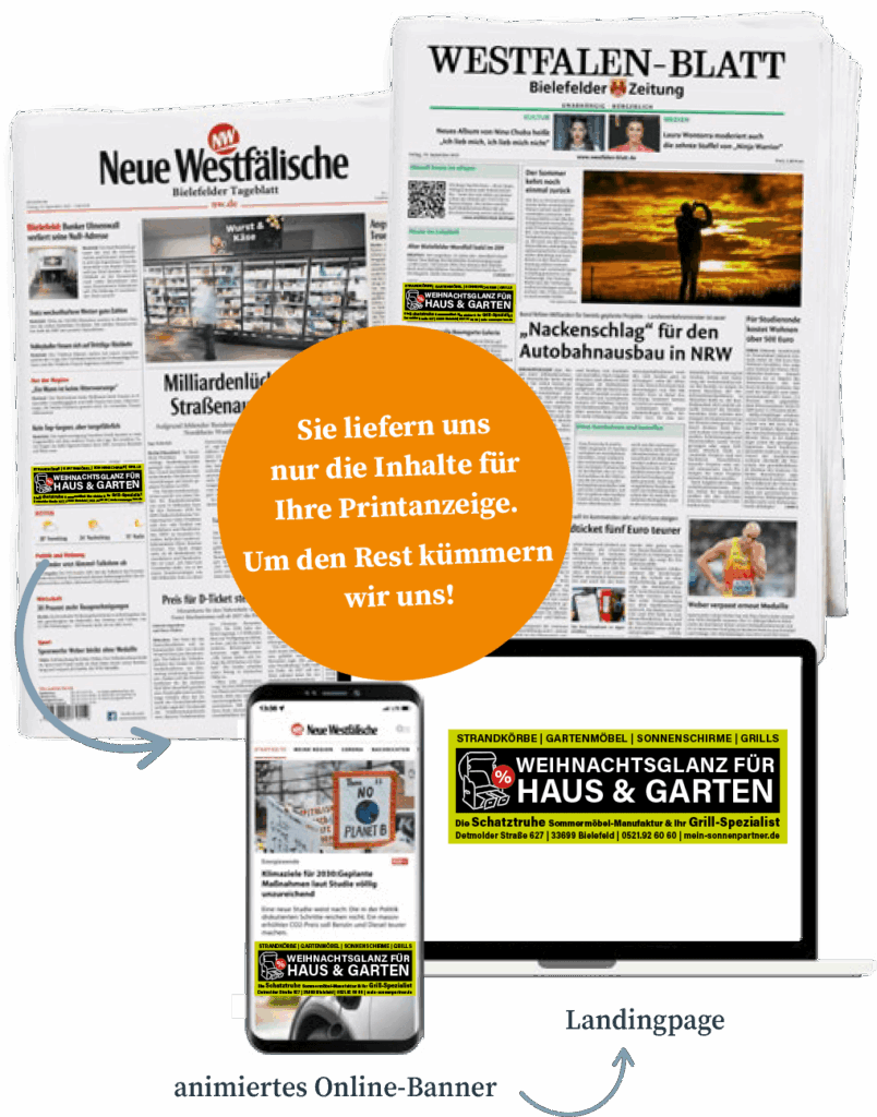 - Platzierung Ihres Banners auf unseren Newsportalen nw.de und westfalen-blatt.de und haller-kreisblatt.de (Desktop + Mobile)